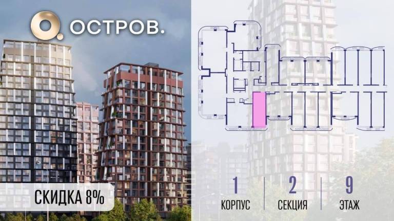 Продаётся квартира от застройщика: общая площадь 28.00 м, жилая 14.40 м, кухня 5.00 м, 9-й этаж, жилой квартал «Остров 14», корпус 1 (секция 2) . Срок сдачи: 2...