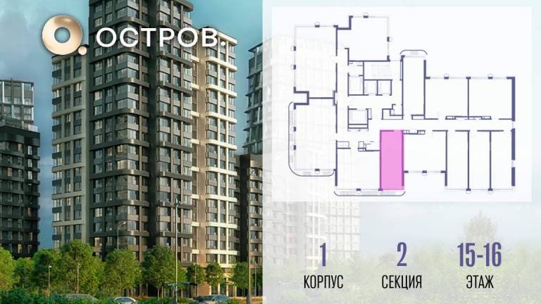 Продаётся 1-комн. квартира от застройщика: общая площадь 38.80 м, жилая 14.10 м, кухня 18.30 м, 16-й этаж, жилой квартал «Остров 14», корпус 1 (секция 2) .
