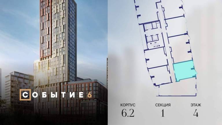 Продаётся 1-комнатная квартира от застройщика: общая площадь 44.80 м, жилая 17.00 м, кухня 20.20 м, 26-й этаж, жилой квартал «Событие-6», корпус 2 (секция 1...