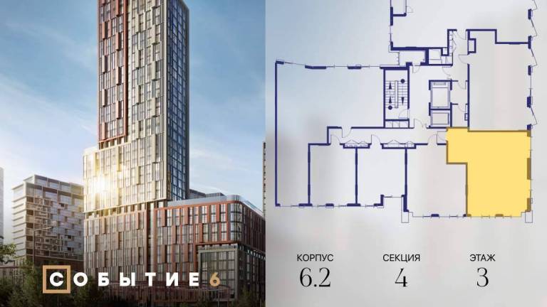 Продаётся 3-комнатная квартира от застройщика: общая площадь 99.20 м, жилая 41.70 м, кухня 23.20 м, 6-й этаж, жилой квартал «Событие-6», корпус 2 (секция 1...