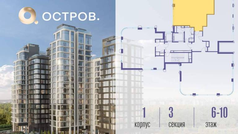 Продаётся 3-комн. квартира от застройщика: общая площадь 119.40 м, жилая 40.90 м, кухня 38.80 м, 18-й этаж, жилой квартал «Остров 7», корпус 6 (секция 2) .