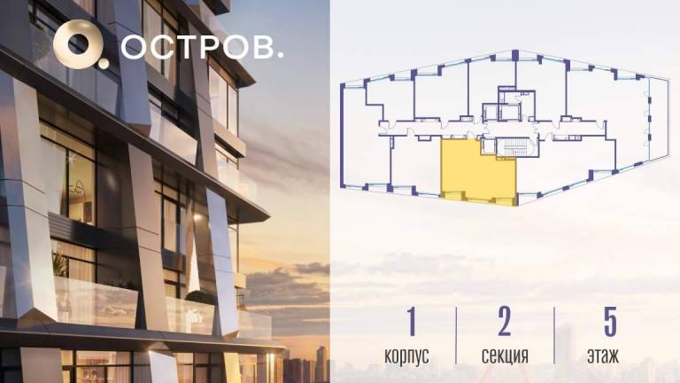 Продаётся 1-комн. квартира от застройщика: общая площадь 47.40 м, жилая 16.80 м, кухня 18.70 м, 14-й этаж, жилой квартал «Остров 12», корпус 1 (секция 2) .