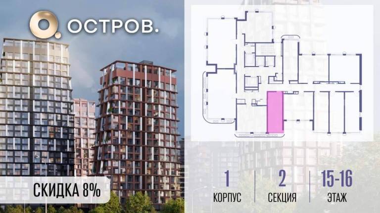 Продаётся 1-комн. квартира от застройщика: общая площадь 38.80 м, жилая 14.10 м, кухня 18.30 м, 15-й этаж, жилой квартал «Остров 14», корпус 1 (секция 2) .