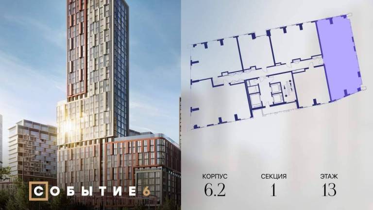 Продаётся 2-комнатная квартира от застройщика: общая площадь 61.80 м, жилая 32.90 м, кухня 17.80 м, 25-й этаж, жилой квартал «Событие-6», корпус 2 (секция 5...