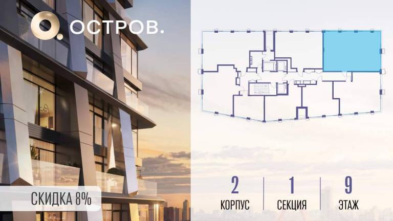 Продаётся 2-комн. квартира от застройщика: общая площадь 80.00 м, жилая 32.30 м, кухня 30.90 м, 10-й этаж, жилой квартал «Остров 12», корпус 1 (секция 1) .