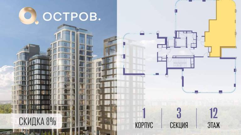 Продаётся 4-комн. квартира от застройщика: общая площадь 131.60 м, жилая 59.40 м, кухня 46.10 м, 2-й этаж, жилой квартал «Остров 12», корпус 1 (секция 3) .