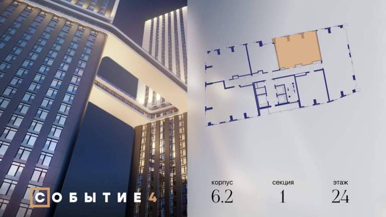 Продаётся 2-комнатная квартира от застройщика: общая площадь 61.90 м, жилая 33.00 м, кухня 17.80 м, 35-й этаж, жилой квартал «Событие-6», корпус 2 (секция 5...