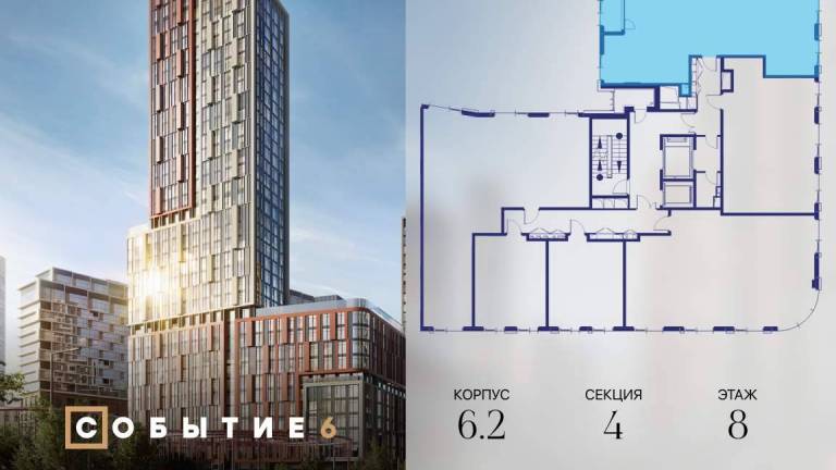 Продаётся 2-комнатная квартира от застройщика: общая площадь 64.60 м, жилая 26.80 м, кухня 20.70 м, 17-й этаж, жилой квартал «Событие-6», корпус 2 (секция 5...