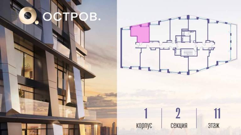 Продаётся 1-комн. квартира от застройщика: общая площадь 47.40 м, жилая 16.80 м, кухня 18.70 м, 14-й этаж, жилой квартал «Остров 12», корпус 1 (секция 2) .