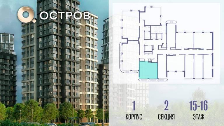 Продаётся 1-комн. квартира от застройщика: общая площадь 38.60 м, жилая 14.10 м, кухня 18.20 м, 16-й этаж, жилой квартал «Остров 14», корпус 1 (секция 2) .