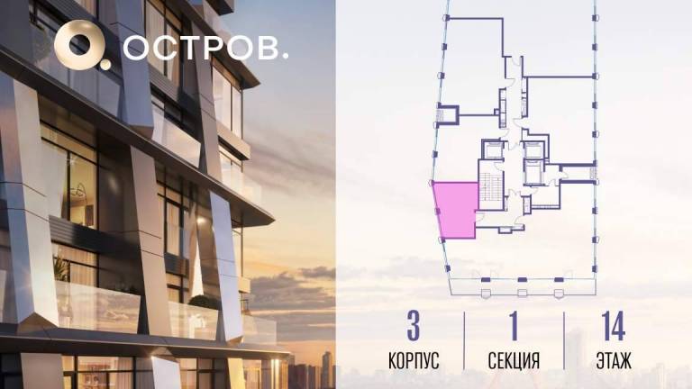 Продаётся 1-комн. квартира от застройщика: общая площадь 42.60 м, жилая 14.70 м, кухня 19.20 м, 17-й этаж, жилой квартал «Остров 12», корпус 3 (секция 1) .