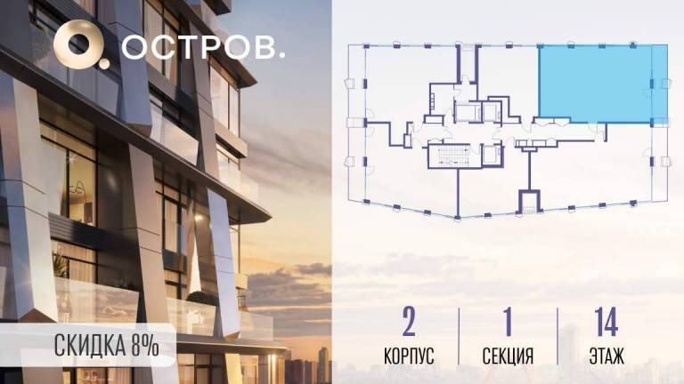 Продаётся 2-комн. квартира от застройщика: общая площадь 71.30 м, жилая 28.80 м, кухня 23.90 м, 14-й этаж, жилой квартал «Остров 12», корпус 2 (секция 1) .