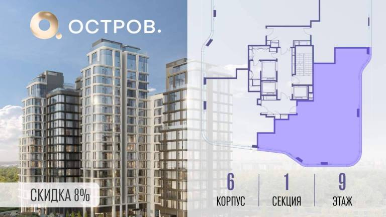 Продаётся 4-комн. квартира от застройщика: общая площадь 141.80 м, жилая 55.80 м, кухня 42.50 м, 2-й этаж, жилой квартал «Остров 12», корпус 1 (секция 1) .