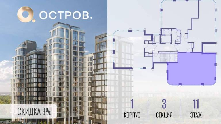 Продаётся 4-комн. квартира от застройщика: общая площадь 131.60 м, жилая 59.40 м, кухня 46.10 м, 2-й этаж, жилой квартал «Остров 12», корпус 1 (секция 3) .