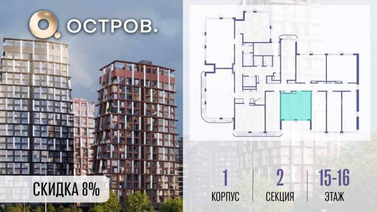 Продаётся 1-комн. квартира от застройщика: общая площадь 38.80 м, жилая 14.10 м, кухня 18.30 м, 16-й этаж, жилой квартал «Остров 14», корпус 1 (секция 2) .