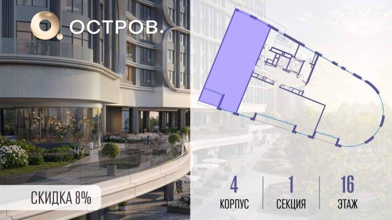 Продаётся 4-комн. квартира от застройщика: общая площадь 128.20 м, жилая 48.40 м, кухня 44.70 м, 16-й этаж, жилой квартал «Остров 7», корпус 4 (секция 2) .