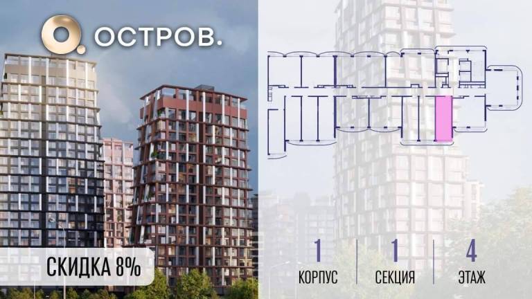 Продаётся квартира от застройщика: общая площадь 28.00 м, жилая 14.40 м, кухня 5.00 м, 4-й этаж, жилой квартал «Остров 14», корпус 1 (секция 1) . Срок сдачи: 2...