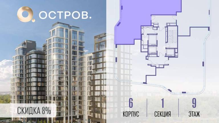 Продаётся 3-комн. квартира от застройщика: общая площадь 119.40 м, жилая 40.90 м, кухня 38.80 м, 18-й этаж, жилой квартал «Остров 7», корпус 6 (секция 2) .