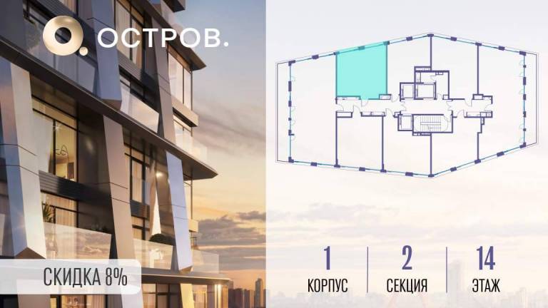 Продаётся 1-комн. квартира от застройщика: общая площадь 44.30 м, жилая 14.20 м, кухня 21.10 м, 21-й этаж, жилой квартал «Остров 12», корпус 3 (секция 1) .