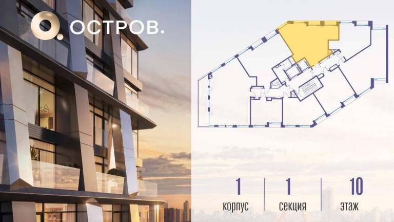Продаётся 1-комн. квартира от застройщика: общая площадь 47.40 м, жилая 14.40 м, кухня 21.60 м, 10-й этаж, жилой квартал «Остров 12», корпус 1 (секция 1) .