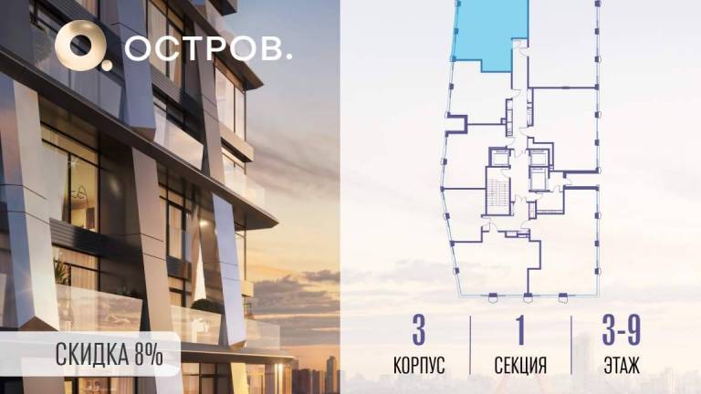 Продаётся 3-комн. квартира от застройщика: общая площадь 67.20 м, жилая 39.80 м, кухня 14.20 м, 19-й этаж, жилой квартал «Остров 12», корпус 3 (секция 1) .