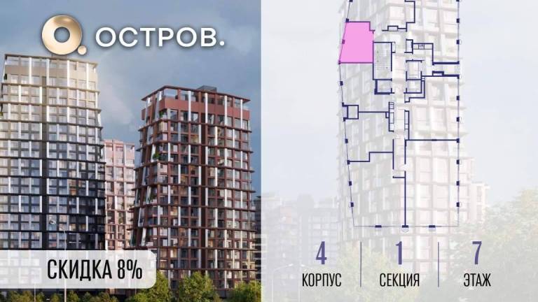 Продаётся 4-комн. квартира от застройщика: общая площадь 123.50 м, жилая 50.30 м, кухня 37.20 м, 10-й этаж, жилой квартал «Остров 12», корпус 1 (секция 2) .