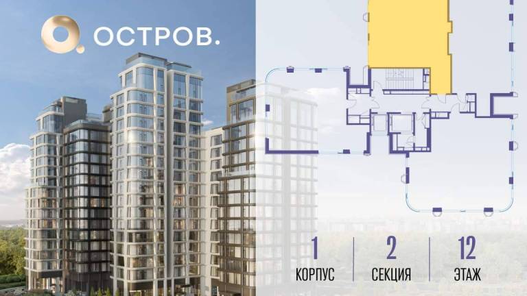 Продаётся 4-комн. квартира от застройщика: общая площадь 123.70 м, жилая 50.20 м, кухня 37.10 м, 2-й этаж, жилой квартал «Остров 12», корпус 1 (секция 2) .