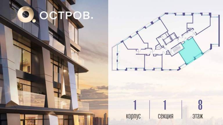 Продаётся 1-комн. квартира от застройщика: общая площадь 42.60 м, жилая 14.70 м, кухня 19.20 м, 19-й этаж, жилой квартал «Остров 12», корпус 3 (секция 1) .