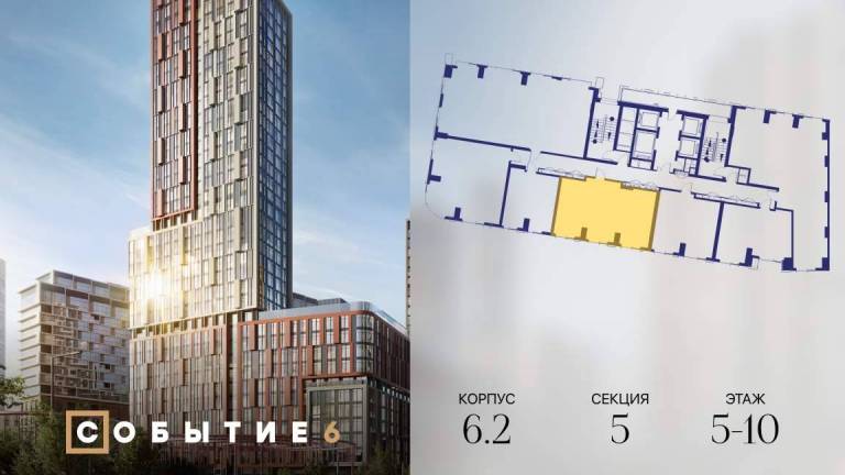 Продаётся 2-комнатная квартира от застройщика: общая площадь 61.80 м, жилая 32.90 м, кухня 17.80 м, 25-й этаж, жилой квартал «Событие-6», корпус 2 (секция 5...