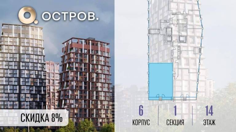 Продаётся 1-комн. квартира от застройщика: общая площадь 38.60 м, жилая 14.10 м, кухня 18.20 м, 10-й этаж, жилой квартал «Остров 14», корпус 1 (секция 2) .