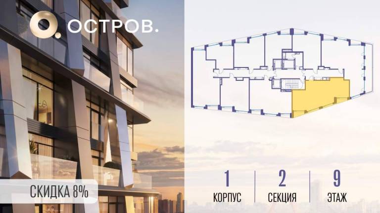 Продаётся 3-комн. квартира от застройщика: общая площадь 107.10 м, жилая 50.30 м, кухня 30.10 м, 2-й этаж, жилой квартал «Остров 12», корпус 1 (секция 1) .