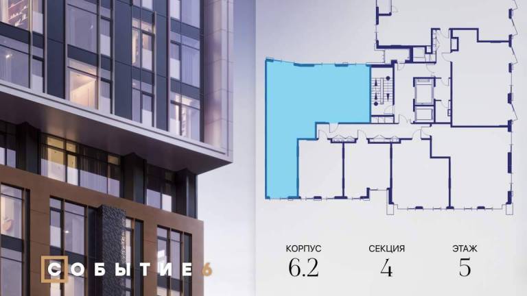 Продаётся 4-комнатная квартира от застройщика: общая площадь 130.90 м, жилая 59.90 м, кухня 28.20 м, 22-й этаж, жилой квартал «Событие-6», корпус 2 (секция 5...