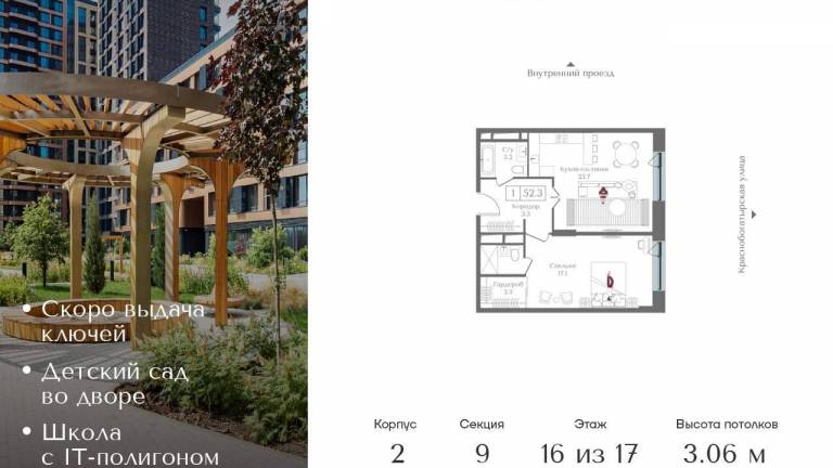 Рассрочка 0% от застройщика. Первоначальный взнос от 20%. Предложение действует до 31 декабря 2025 года Квартира на 17 этаже в жилом комплексе премиум-класса...