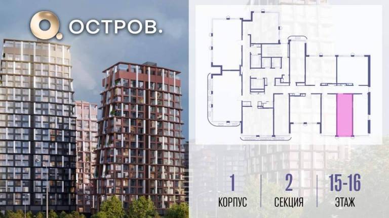 Продаётся 1-комн. квартира от застройщика: общая площадь 42.90 м, жилая 14.10 м, кухня 19.70 м, 15-й этаж, жилой квартал «Остров 14», корпус 1 (секция 2) .