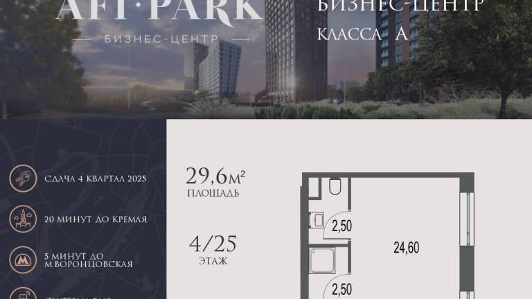 Фильтры1Продается просторное коммерческое помещение общей площадью 29,6 м2 на 4 этаже в строящемся бизнес-центре AFI Park. 21-этажный бизнес-центр AFI Park...