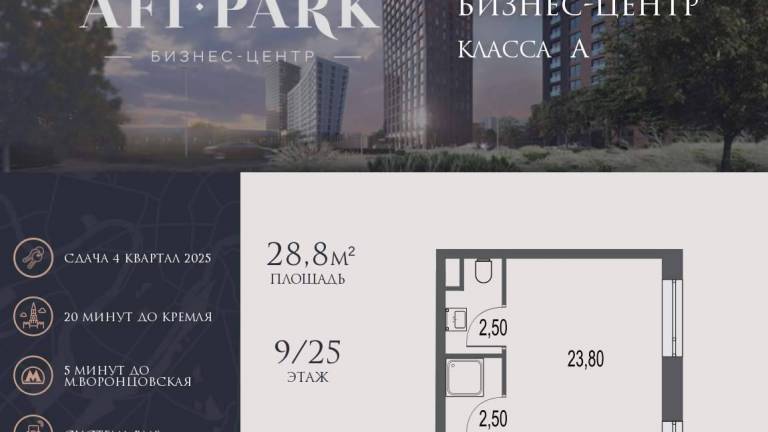 Продается просторное коммерческое помещение общей площадью 28,8 м2 на 9 этаже в строящемся бизнес-центре AFI Park. 21-этажный бизнес-центр AFI Park...