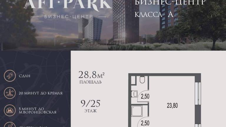 Продается просторное коммерческое помещение общей площадью 28,8 на 9 этаже в готовом бизнес-центре AFI Park. Строительство комплекса завершено. 21-этажный...