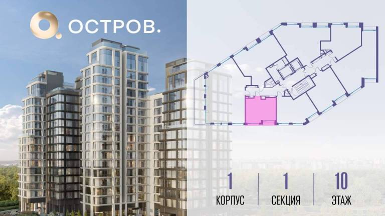 Продаётся 1-комн. квартира от застройщика: общая площадь 44.30 м, жилая 14.20 м, кухня 21.10 м, 21-й этаж, жилой квартал «Остров 12», корпус 3 (секция 1) .