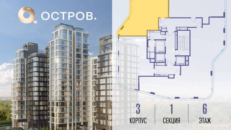 Продаётся 3-комн. квартира от застройщика: общая площадь 119.40 м, жилая 40.90 м, кухня 38.80 м, 18-й этаж, жилой квартал «Остров 7», корпус 6 (секция 2) .