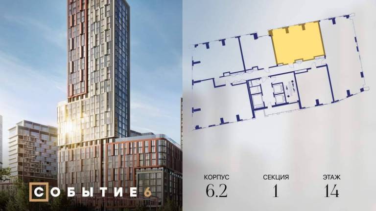 Продаётся 2-комнатная квартира от застройщика: общая площадь 61.90 м, жилая 33.00 м, кухня 17.80 м, 35-й этаж, жилой квартал «Событие-6», корпус 2 (секция 5...