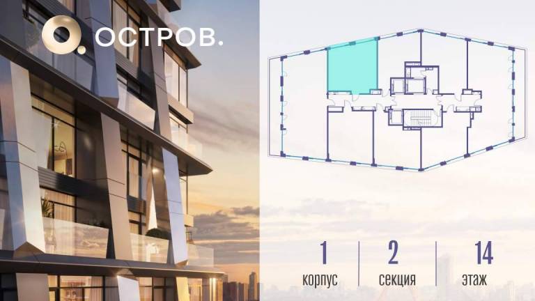 Продаётся 1-комн. квартира от застройщика: общая площадь 44.30 м, жилая 14.20 м, кухня 21.10 м, 21-й этаж, жилой квартал «Остров 12», корпус 3 (секция 1) .