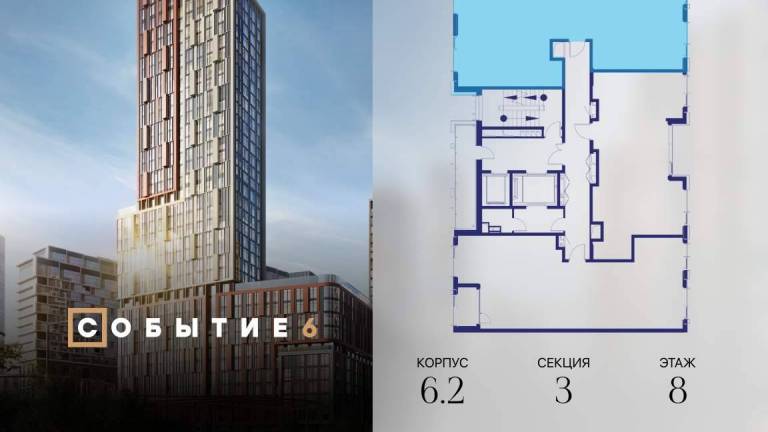 Продаётся 3-комнатная квартира от застройщика: общая площадь 79.40 м, жилая 39.80 м, кухня 20.60 м, 8-й этаж, жилой квартал «Событие-6», корпус 2 (секция 4...