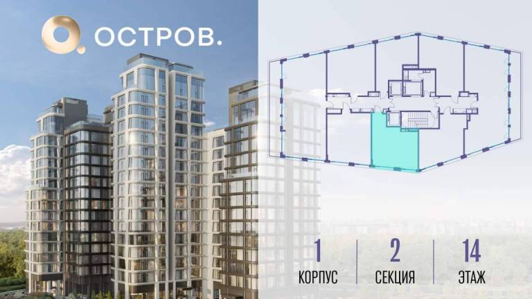 Продаётся 1-комн. квартира от застройщика: общая площадь 51.10 м, жилая 17.10 м, кухня 22.90 м, 14-й этаж, жилой квартал «Остров 12», корпус 1 (секция 2) .
