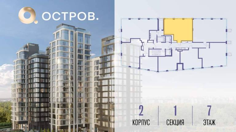 Продаётся 4-комн. квартира от застройщика: общая площадь 128.60 м, жилая 48.10 м, кухня 44.70 м, 12-й этаж, жилой квартал «Остров 7», корпус 4 (секция 2) .