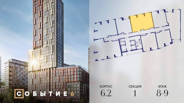 Продаётся 2-комнатная квартира от застройщика: общая площадь 61.80 м, жилая 32.90 м, кухня 17.80 м, 25-й этаж, жилой квартал «Событие-6», корпус 2 (секция 5...