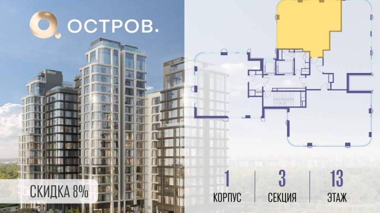 Продаётся 4-комн. квартира от застройщика: общая площадь 131.50 м, жилая 59.30 м, кухня 46.10 м, 8-й этаж, жилой квартал «Остров 12», корпус 1 (секция 3) .
