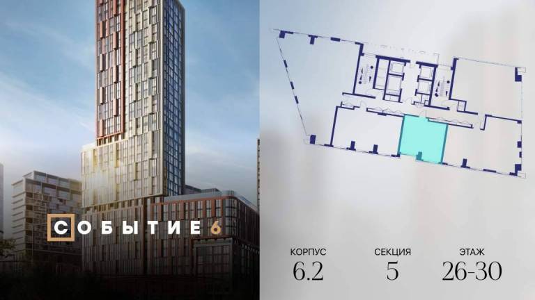 Продаётся 1-комнатная квартира от застройщика: общая площадь 38.80 м, жилая 14.90 м, кухня 16.00 м, 30-й этаж, жилой квартал «Событие-6», корпус 2 (секция 5...
