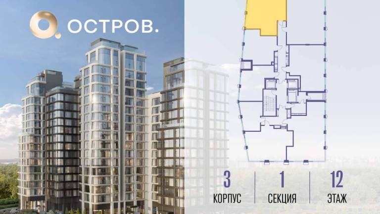 Продаётся 3-комн. квартира от застройщика: общая площадь 106.30 м, жилая 50.30 м, кухня 29.80 м, 4-й этаж, жилой квартал «Остров 12», корпус 1 (секция 1) .