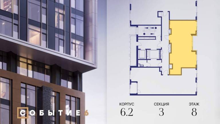 Продаётся 3-комнатная квартира от застройщика: общая площадь 76.00 м, жилая 37.00 м, кухня 20.60 м, 7-й этаж, жилой квартал «Событие-6», корпус 2 (секция 4...