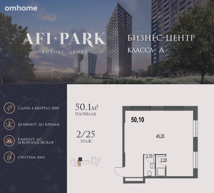 Воронцовский парк, а высокие потолки и остекление «в пол» наполняют офисное пространство дополнительным воздухом и светом. Инфраструктура бизнес-центра создана с учетом ежедневных потребностей офисных резидентов. У входа расположена зона для посадки в такси и 11 гостевых машино-мест. В подземной части находится паркинг на 44 машино- места. На первом этаже – лобби с комфортной зоной ожиданий, кофе-поинтами и банкоматами, ресторан и торговое пространство с сервисами быта.